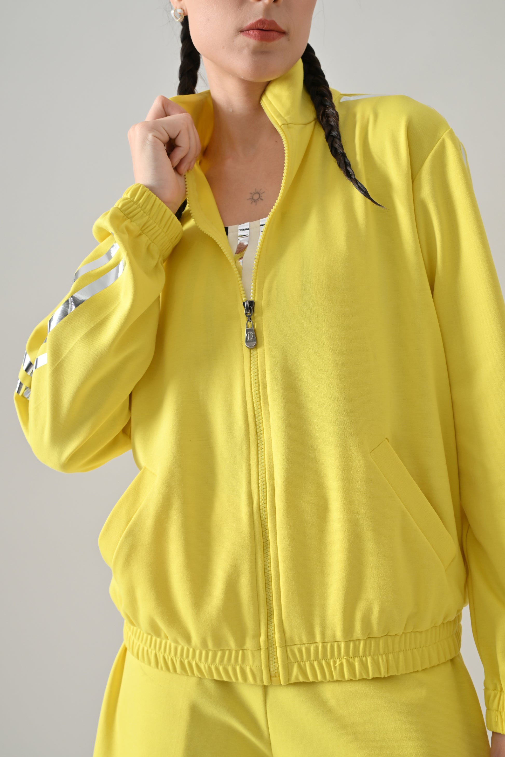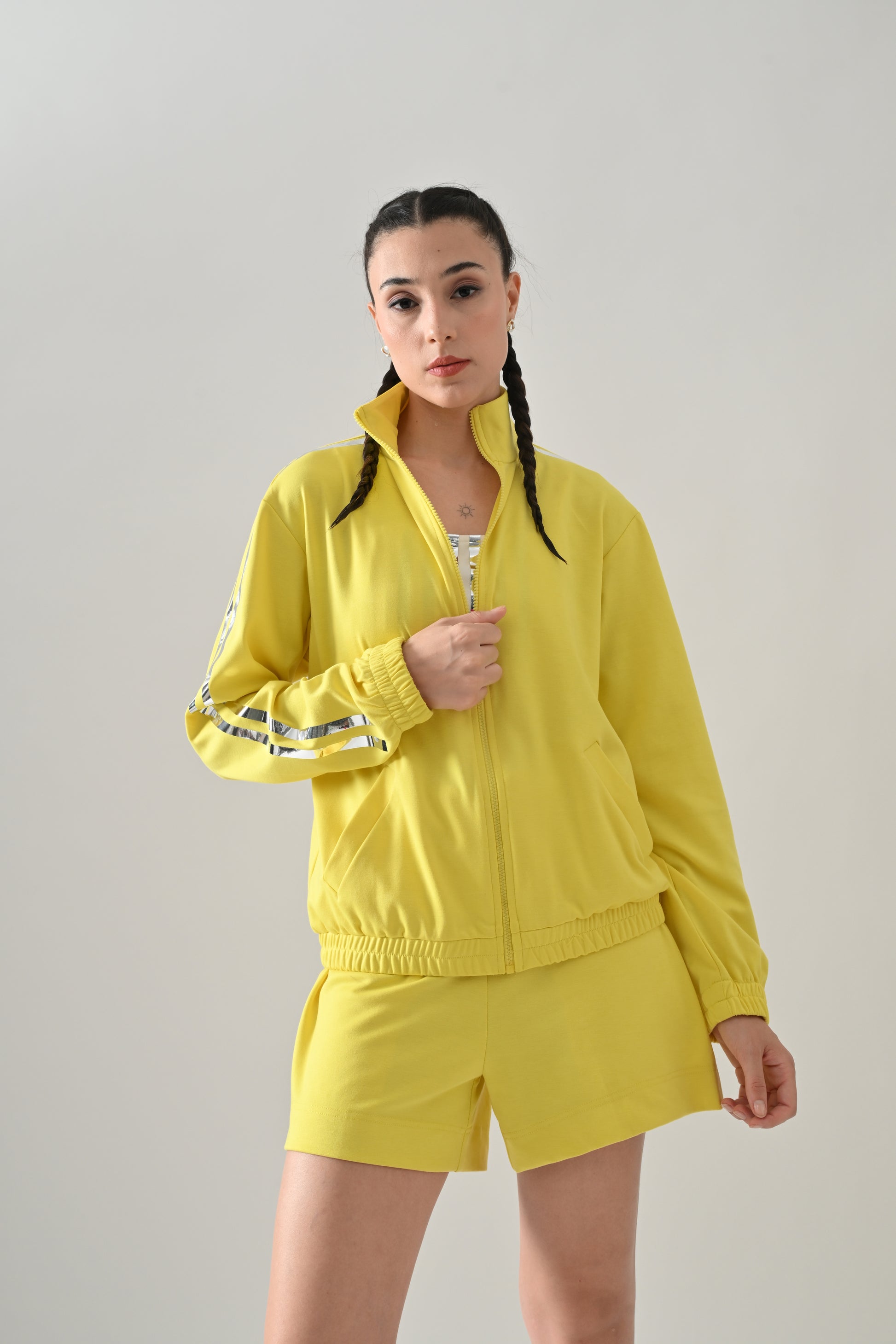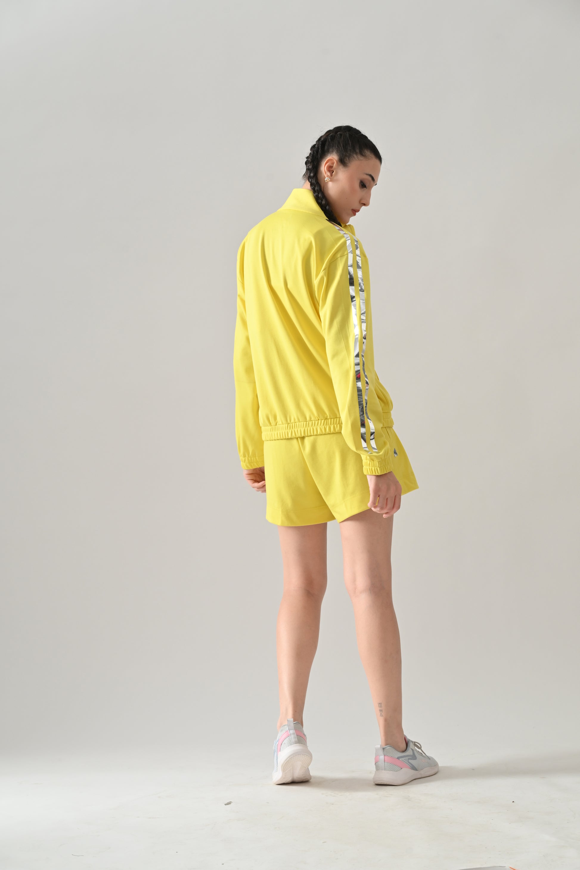 Colorblock fantasy in a citrus mood. Citrus Pop is a 3-piece set in lemon, white and grey featuring a cropped inner, cool utility shirt, and comfy shorts. With reflective print deets and major sunny energy, this is for the girls who vacay hard.