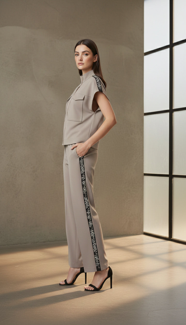 The neutral sand tone is balanced with striking black accents, creating a powerful layered look that transitions effortlessly from day to evening. Wear it as a complete set for a sharp, commanding silhouette or style each piece individually for versatile wardrobe moments.