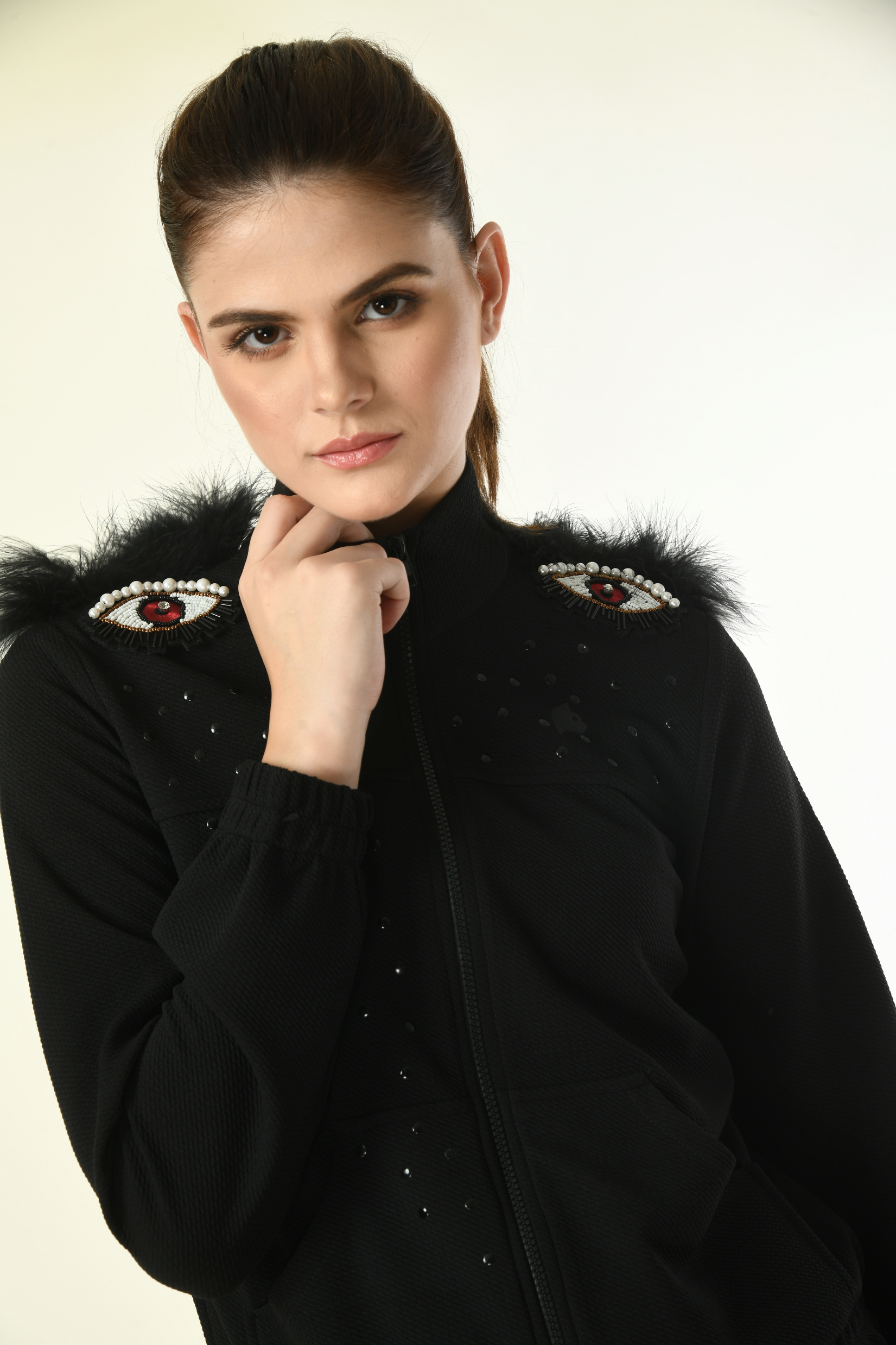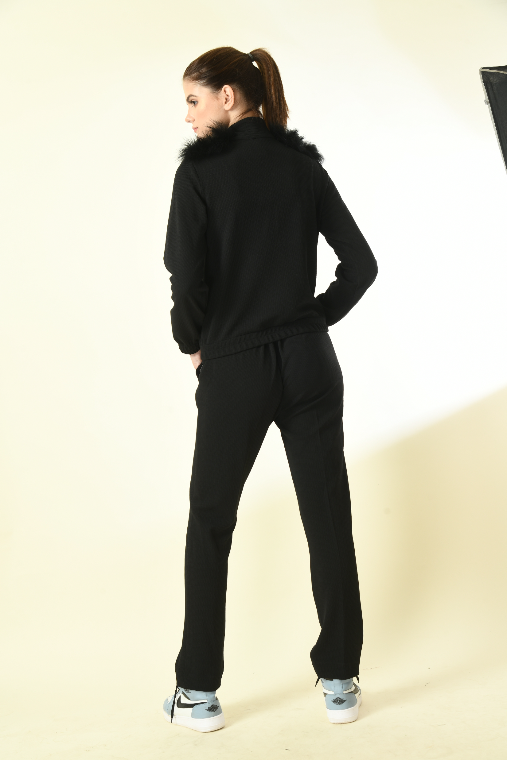 Transform your look with this luxurious athleisure wear co ord set by Just Billi. Featuring eye-catching embroidered patches on the shoulders and beautiful fur details, you'll look stunning for any evening event. Elevate your style with this modern, glamorous set.