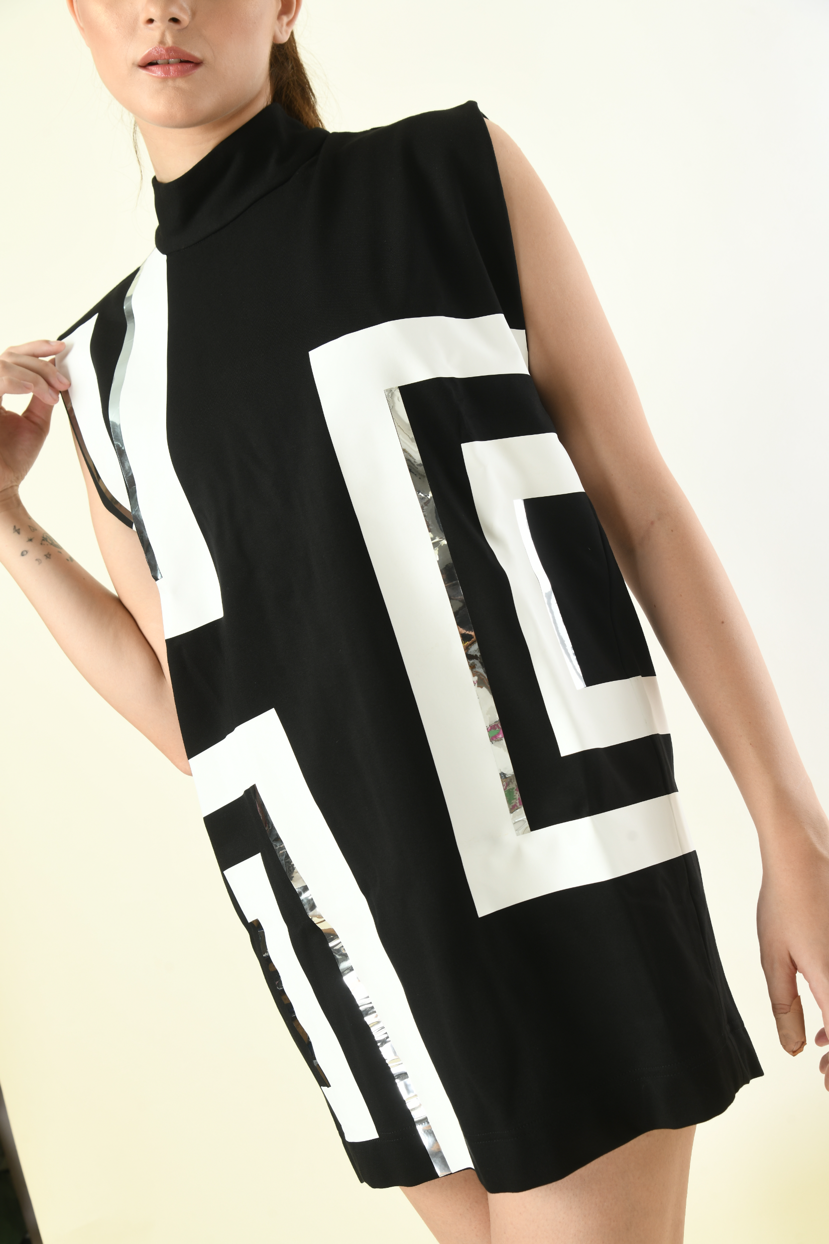 Give your wardrobe a sleek upgrade with this graphic dress that embodies elegance and allure. With its black hue and flattering silhouette, this dress is a classic choice for any occasion. It screams confidence with sophistication.