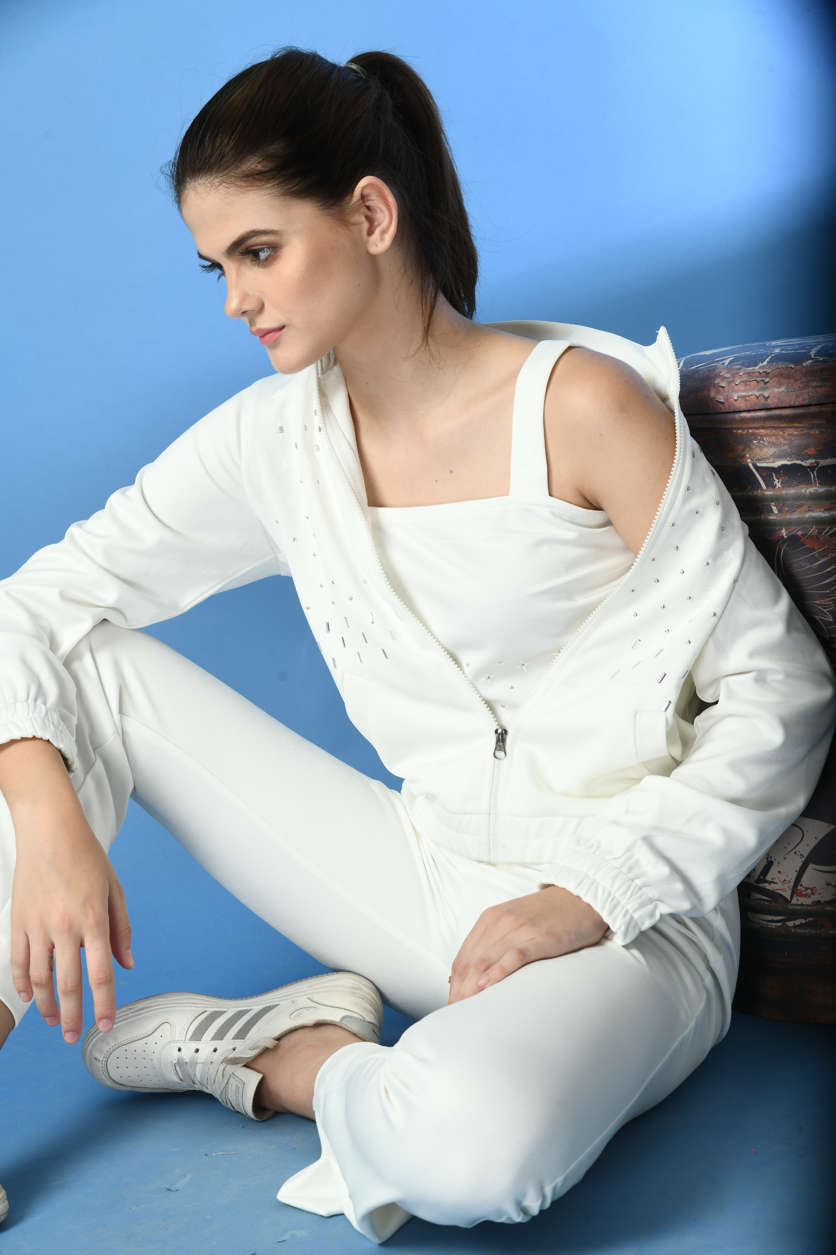Take your athleisure style to the next level with our "Ivory Fusion" 3-piece set! Blending comfy and chic, our studded top and jacket give you a luxe look that'll take you from day to night. Perfect for any special occasion, you'll always be dressed to impress!