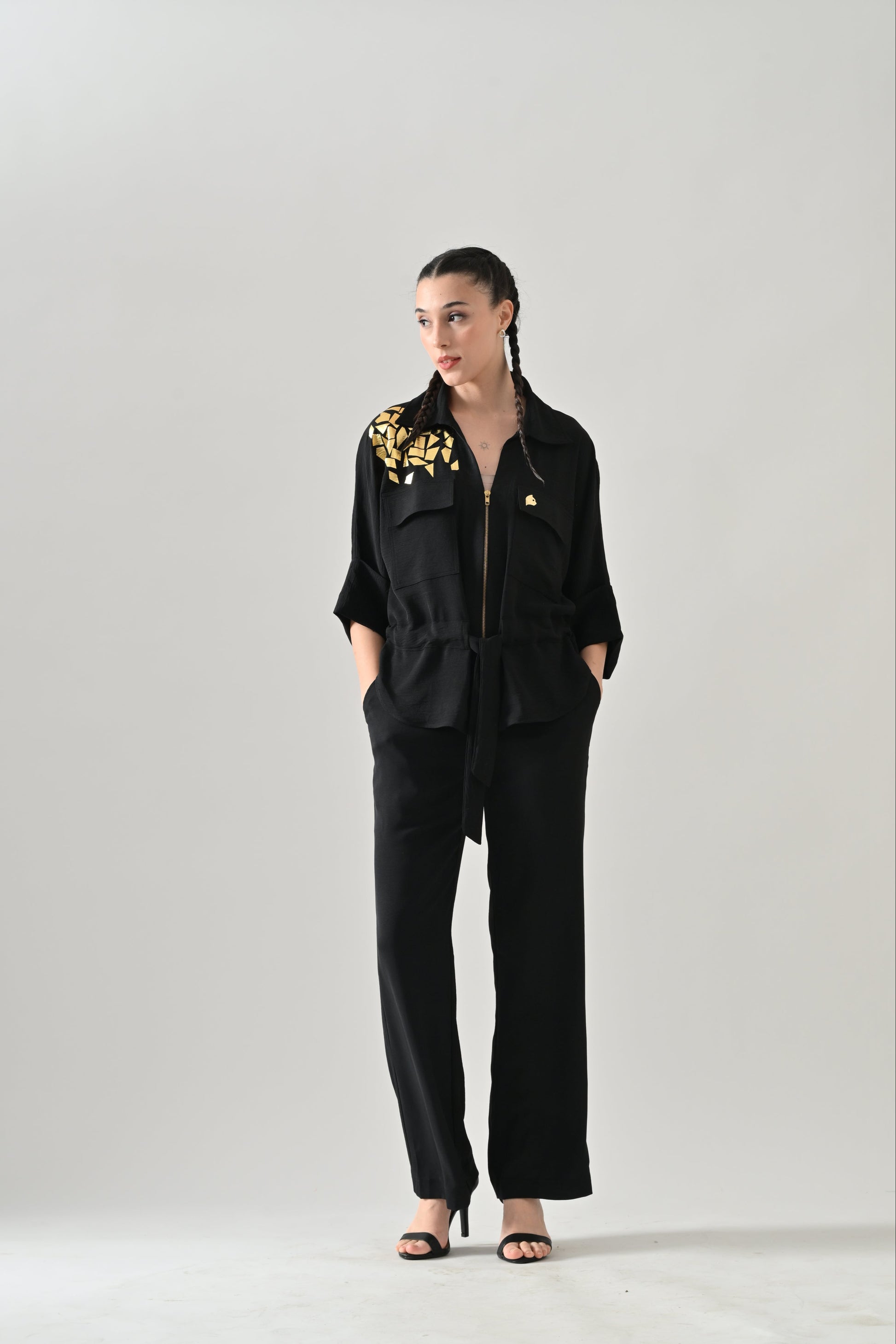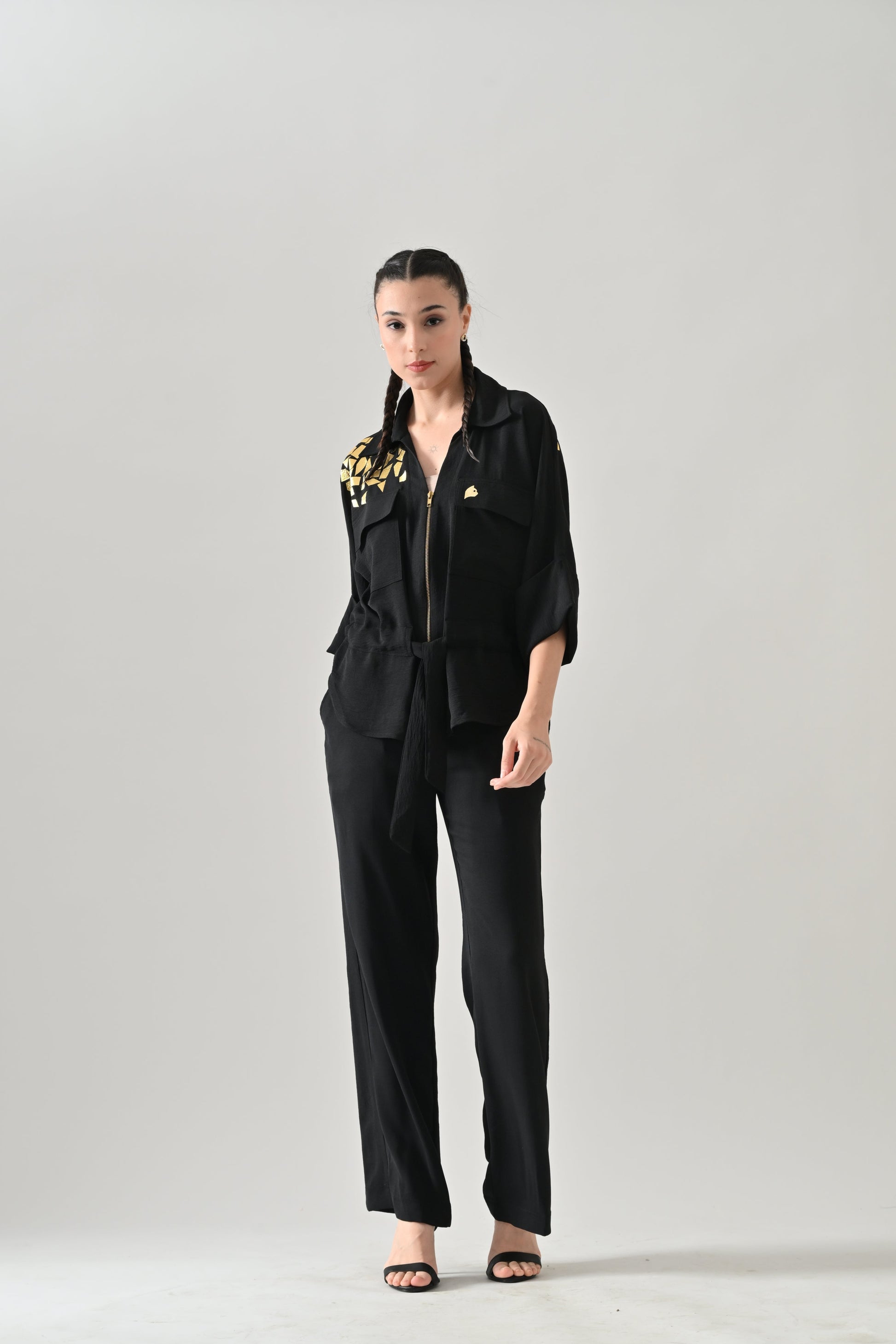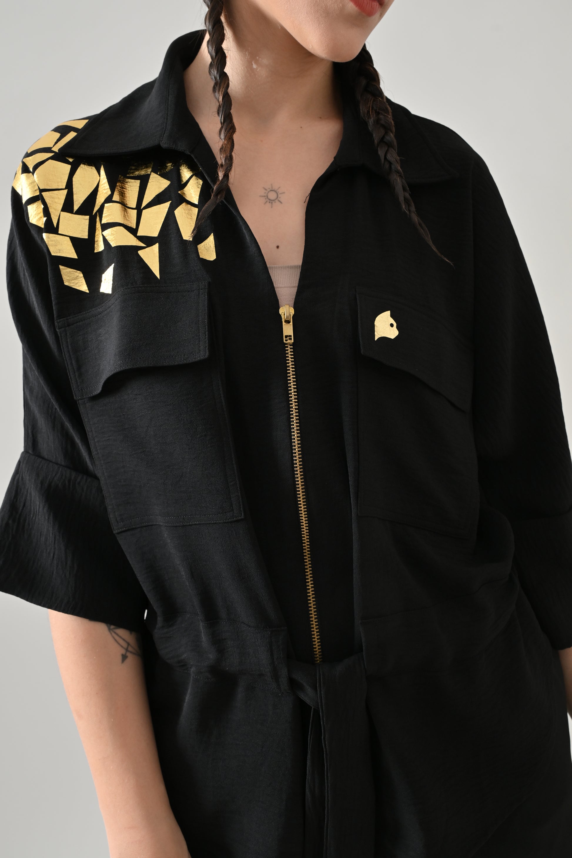 Midnight Metal mixes glam and grit. Think: black-on-black coordination, crushed metallic reflective print and a tie-up shirt with attitude. Sleek, sharp and ready to sparkle when the flash hits.