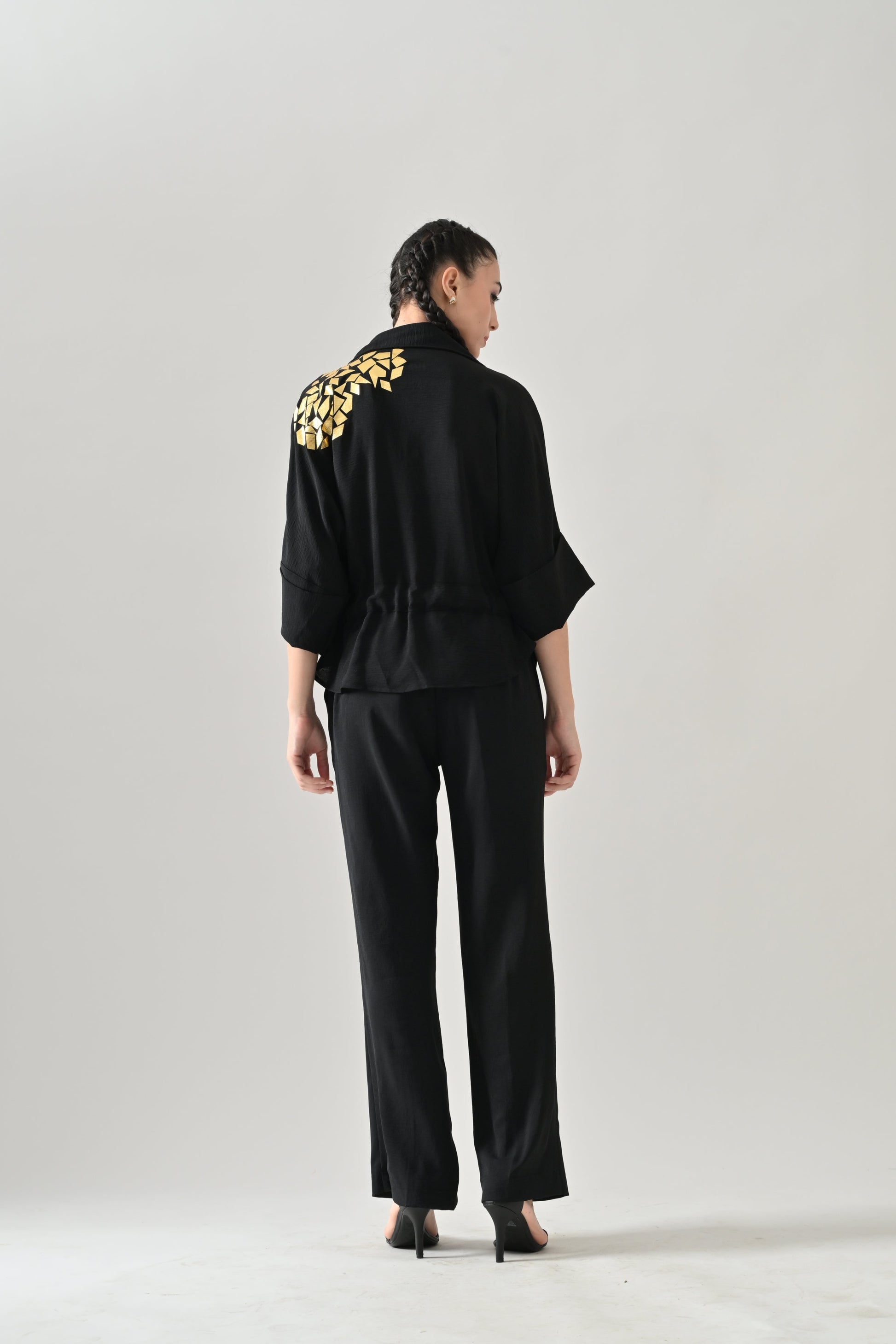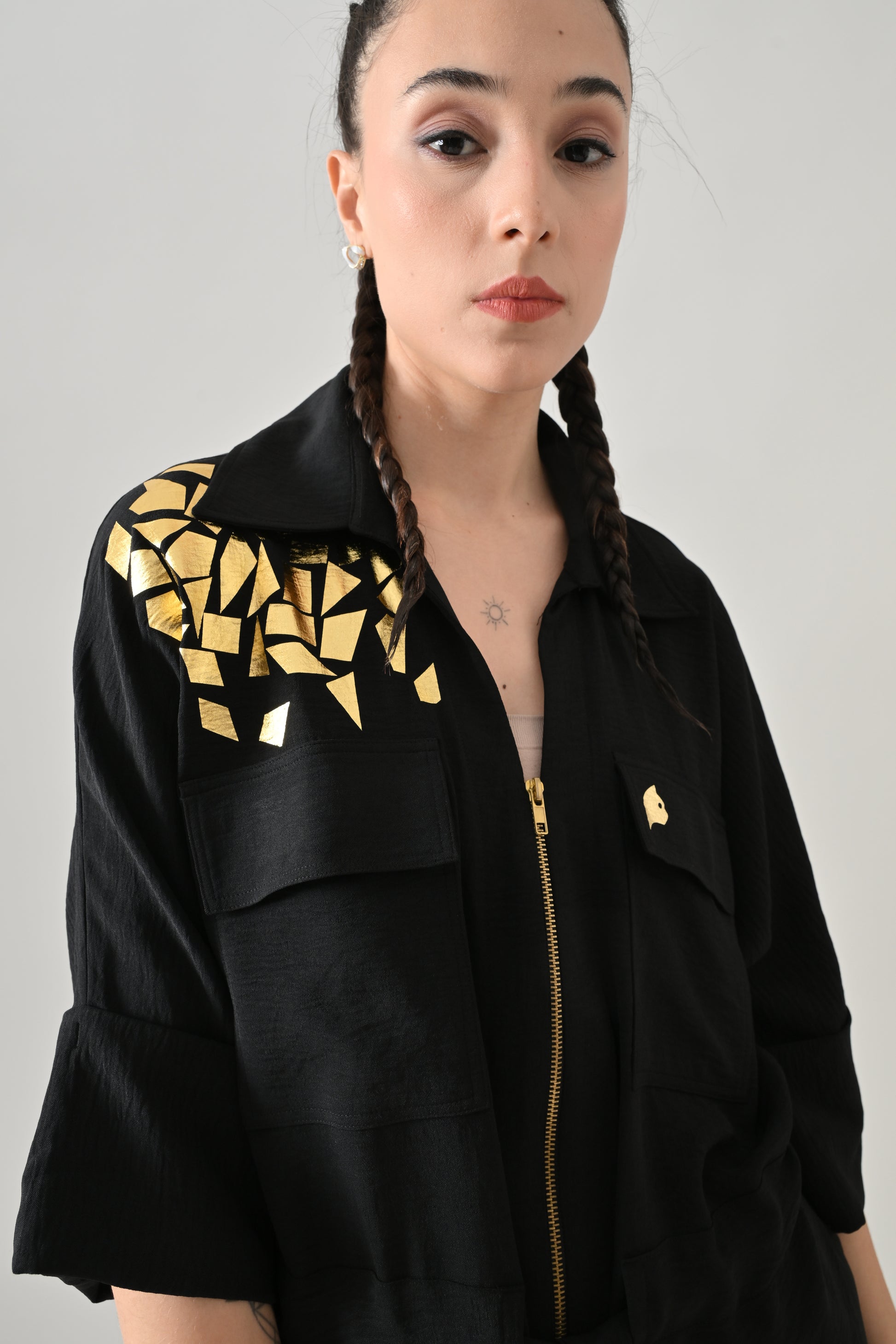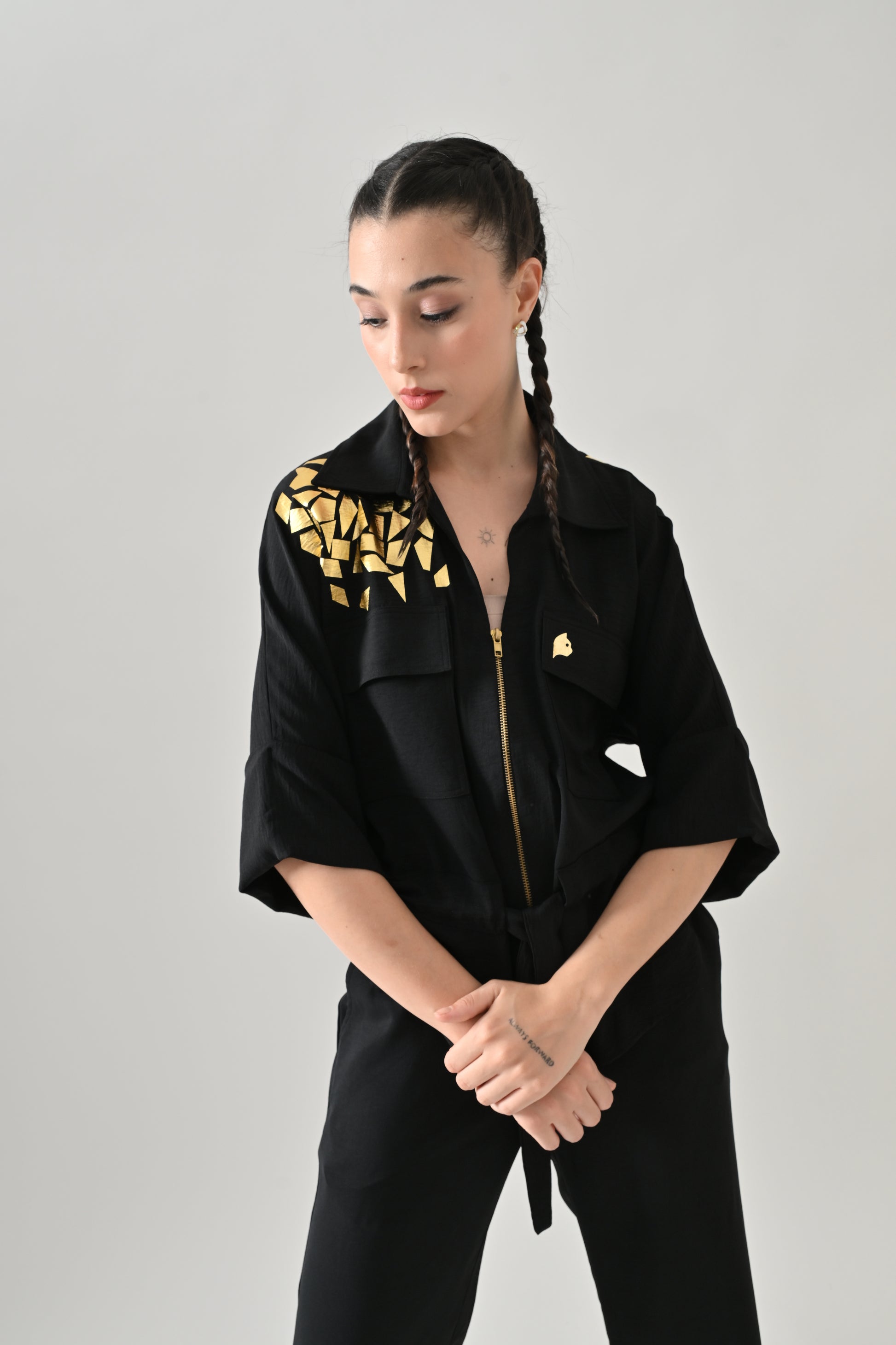 Midnight Metal mixes glam and grit. Think: black-on-black coordination, crushed metallic reflective print and a tie-up shirt with attitude. Sleek, sharp and ready to sparkle when the flash hits.