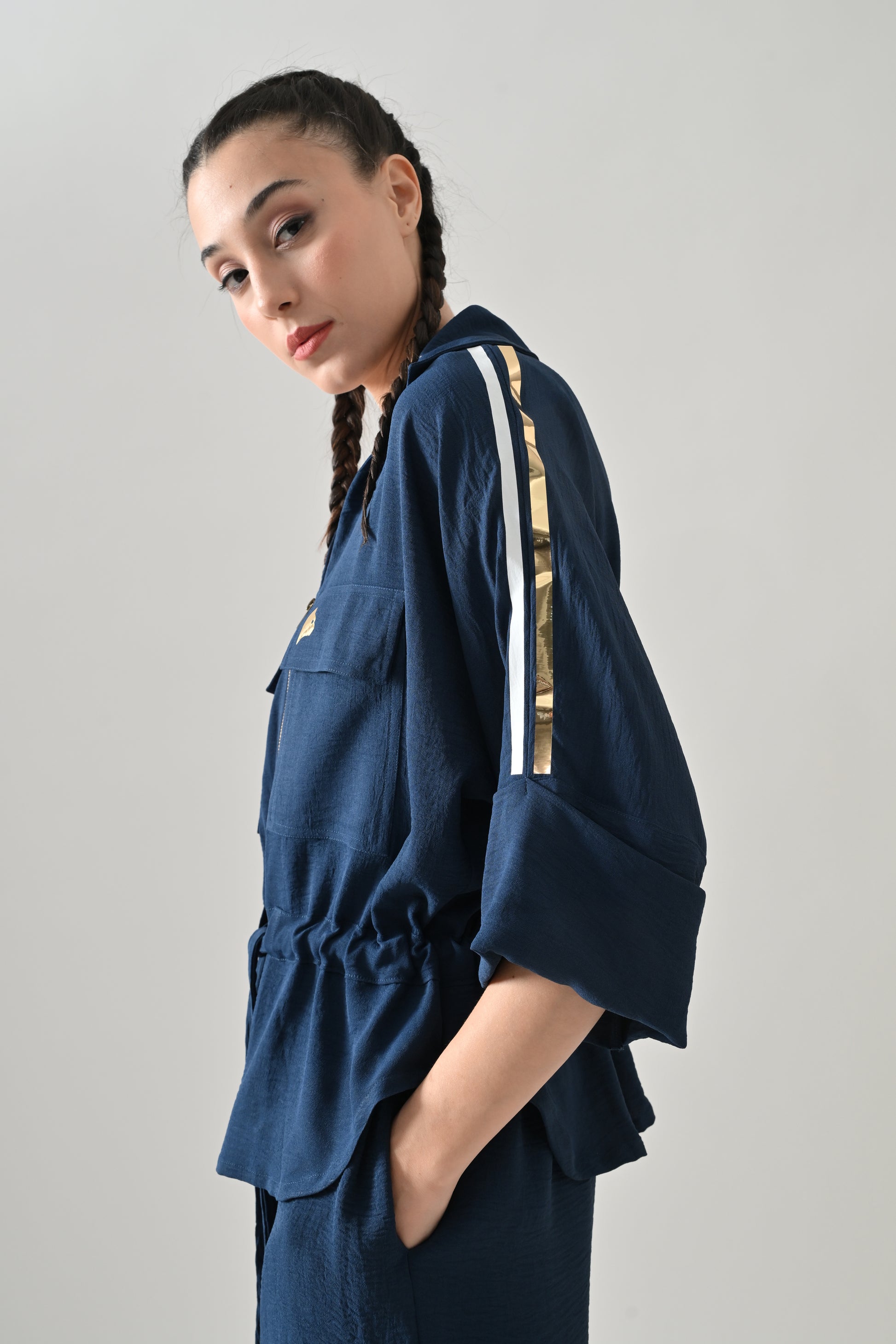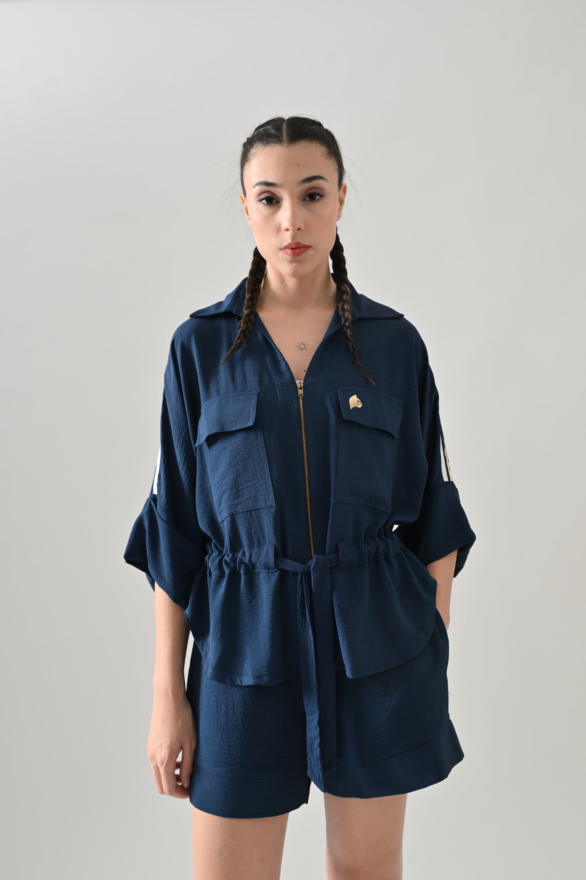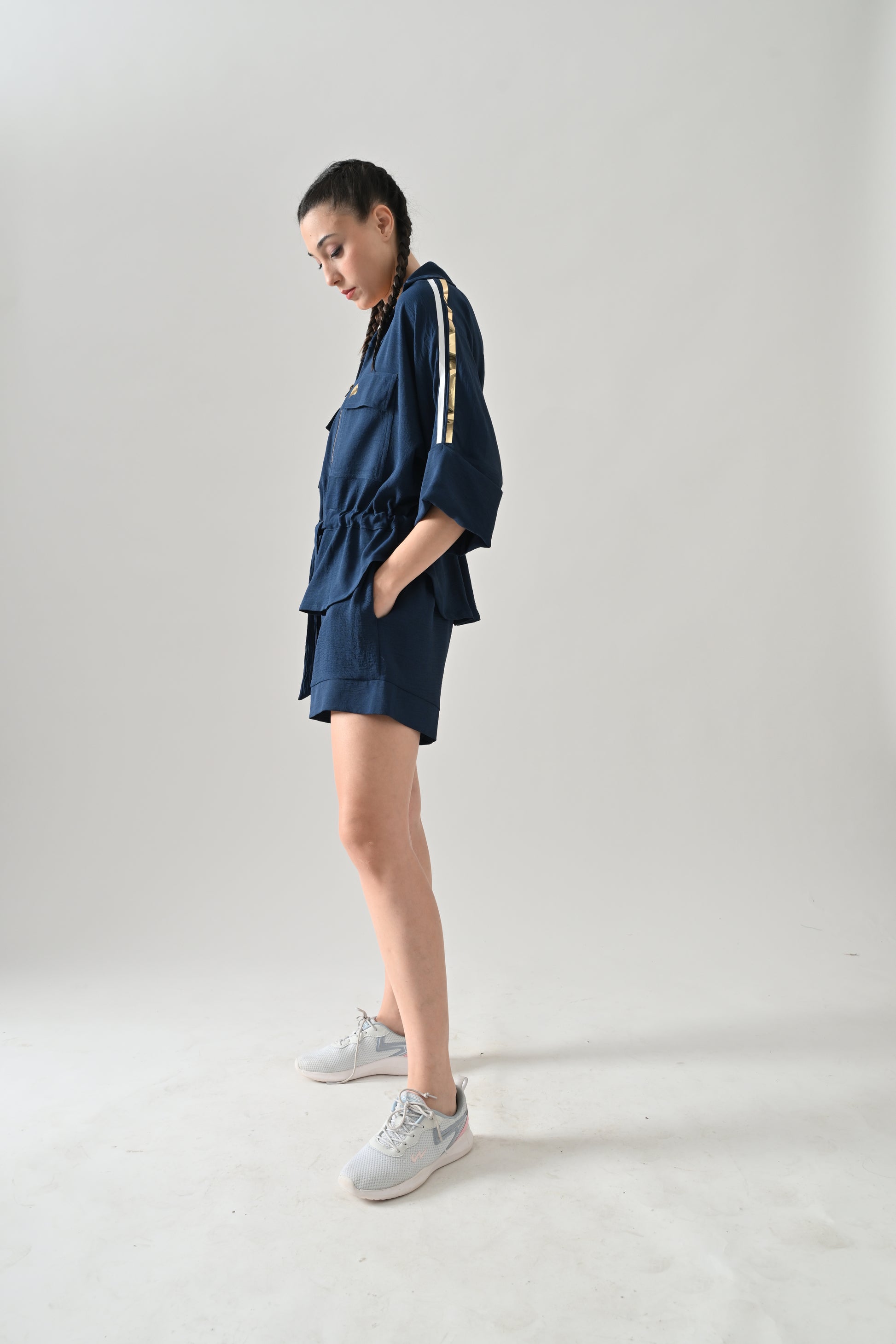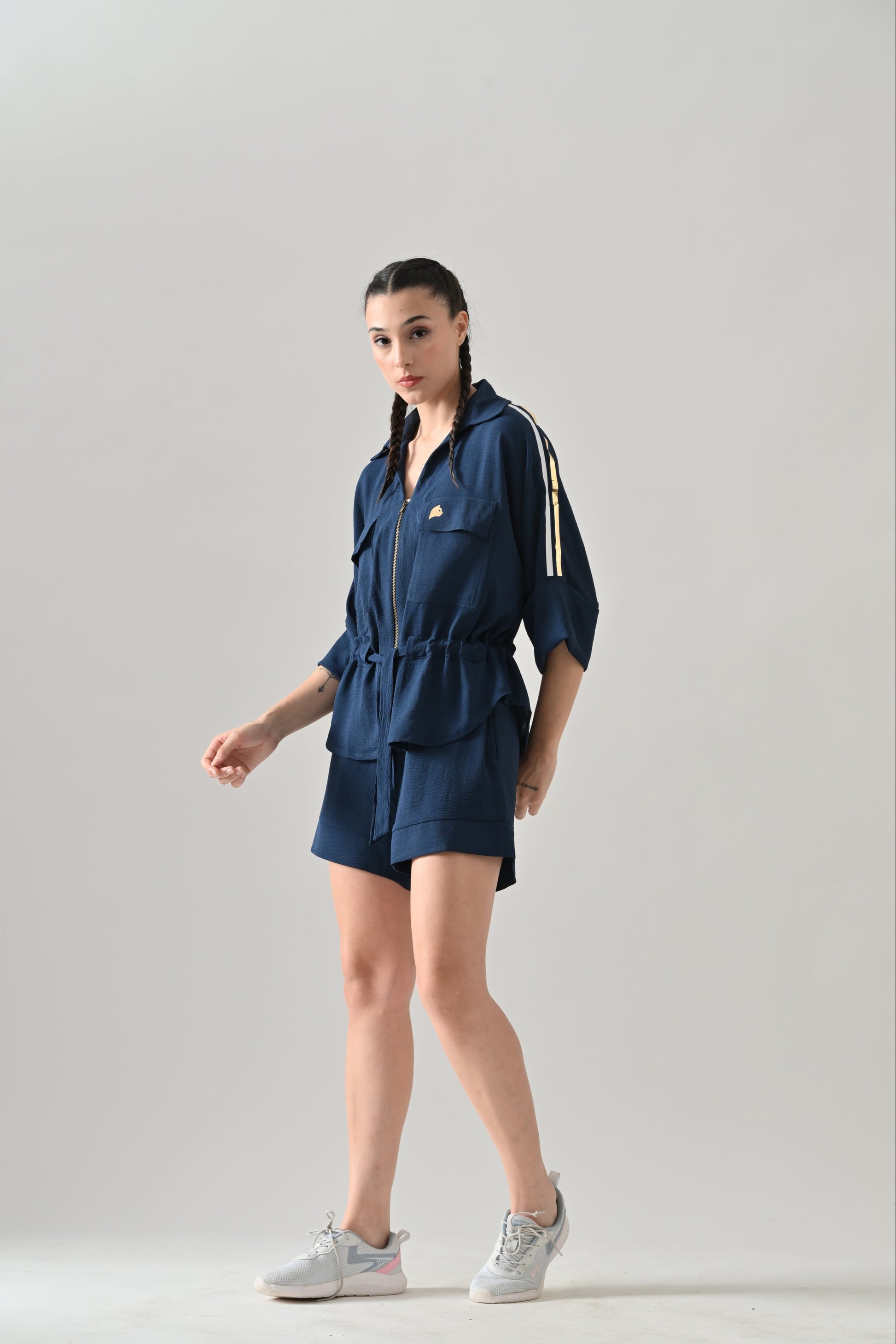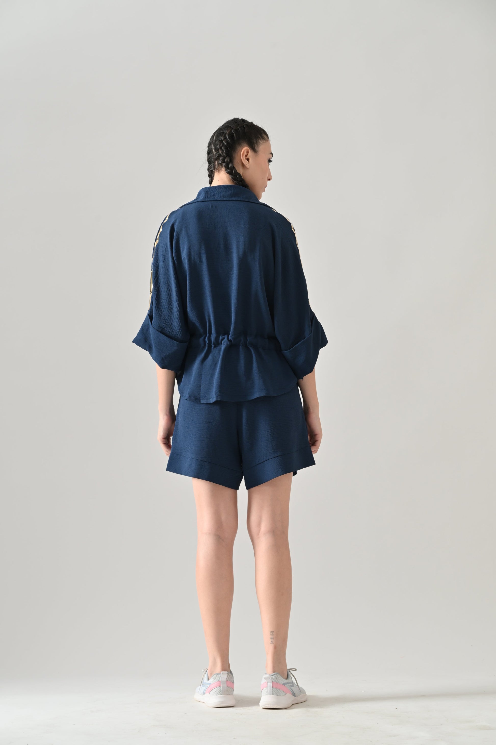 Midnight Motion is a 2-piece slay kit—high-shine shirt, edgy short, and sharp detailing with a metallic finish. Styled to stun from rooftop to roadtrip.