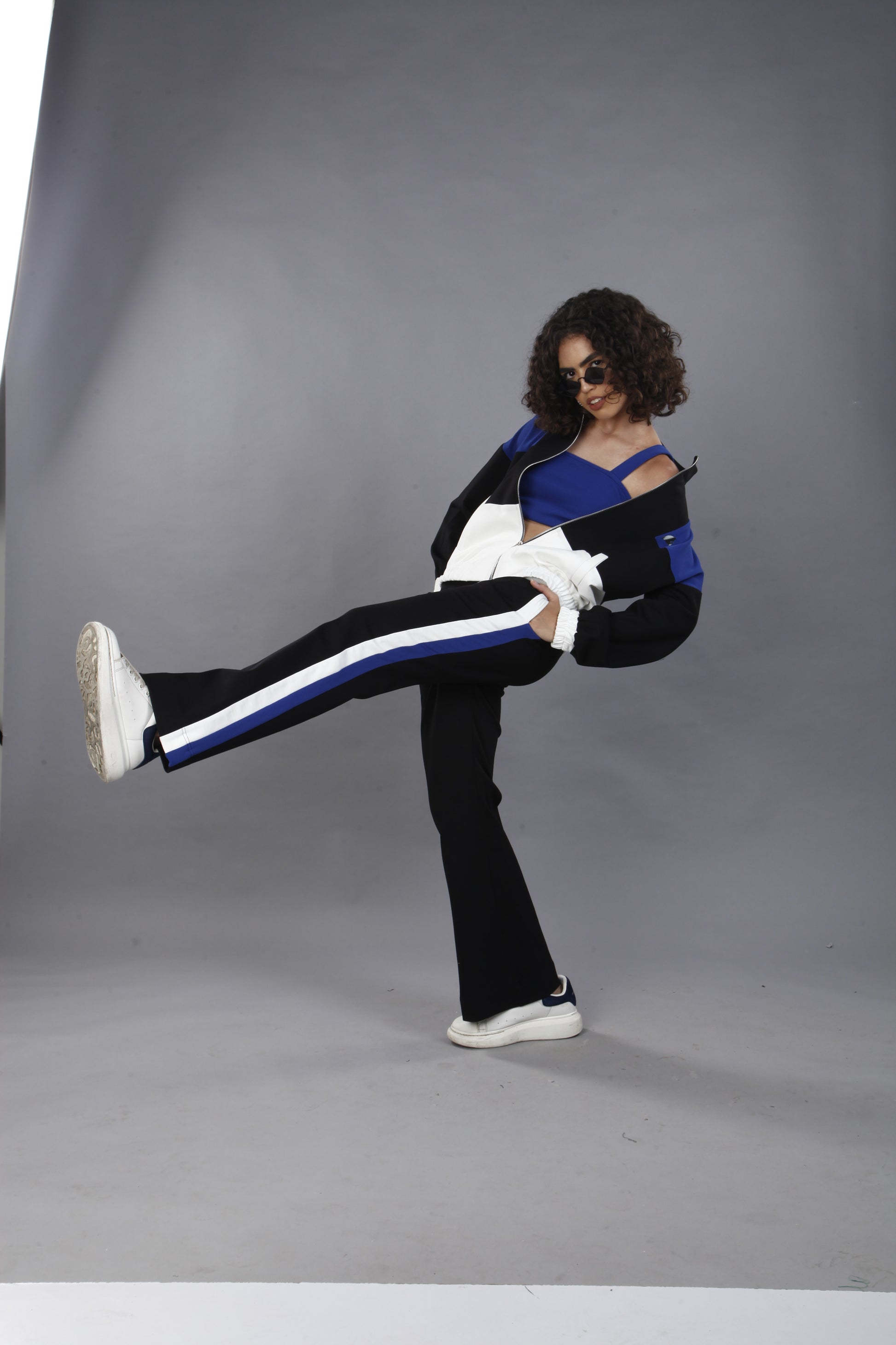 The “Nautical Block” athleisure outfit features a striking color block design in blue, black, and navy. The outfit combines sporty functionality with a sleek aesthetic, making it perfect for both workouts and casual outings. Its bold color palette and modern lines offer a sophisticated yet dynamic look.