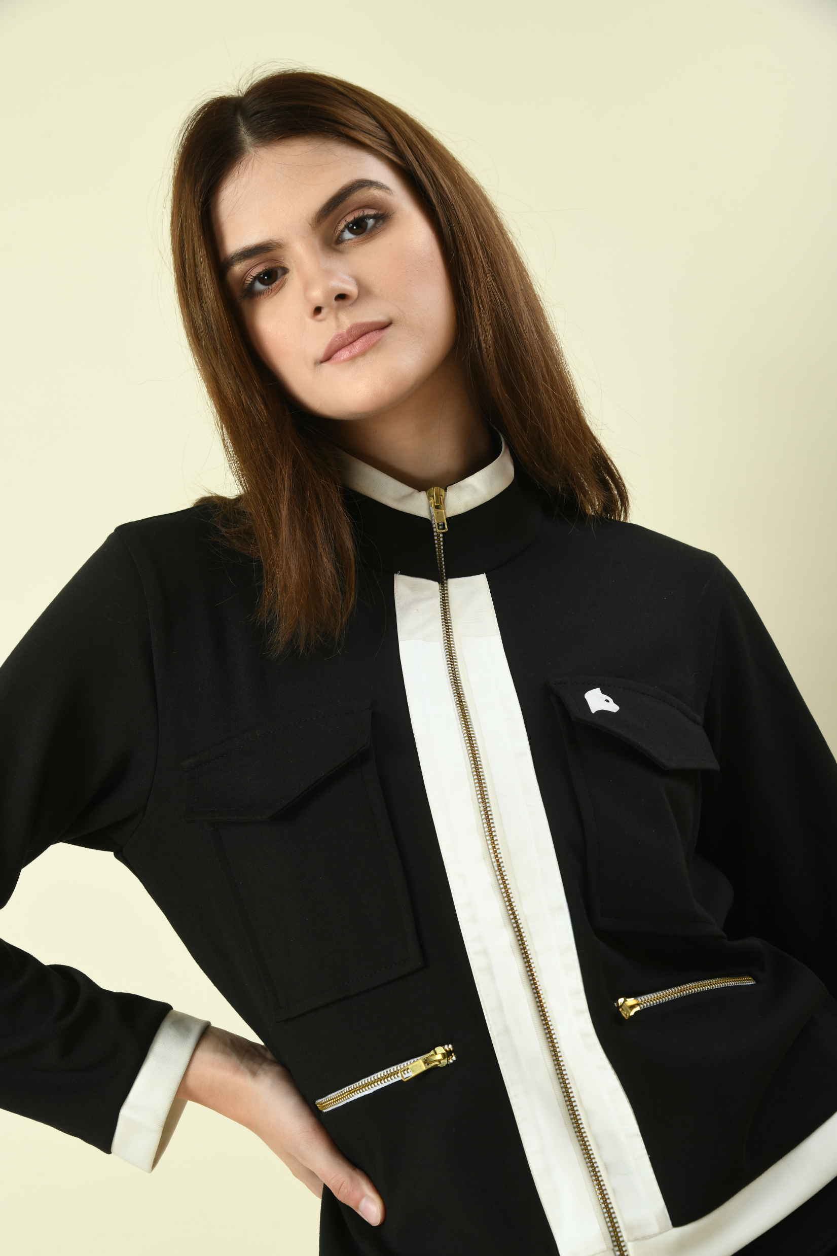 Capture the perfect style for any occasion with this chic co cord set. A statement jacket is paired with a flirty A-line skirt and tube top, creating a look that you can dress up or down. Create a playful daytime vibe with sneakers, or make a glam statement with thigh high boots or heels. Experience day-to-evening glamour in one stylish co-ord set.