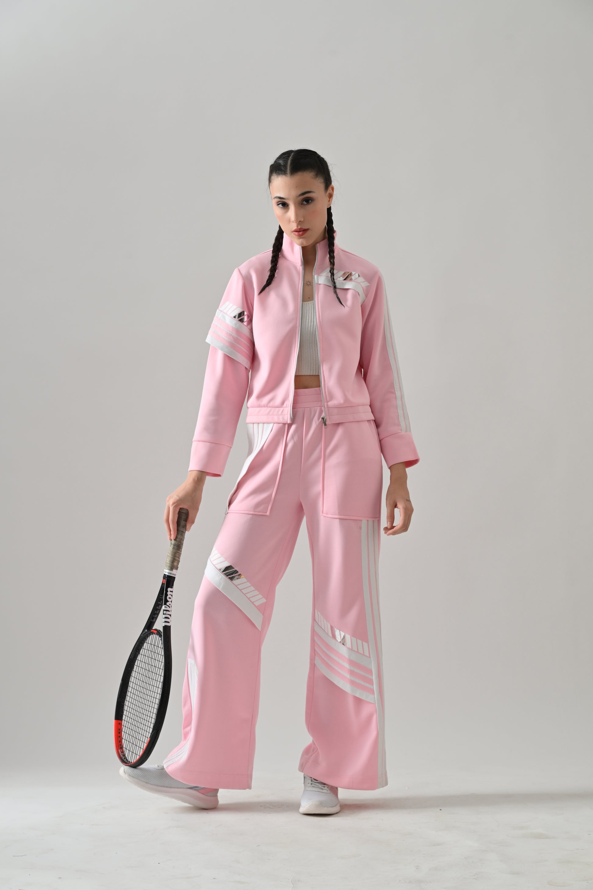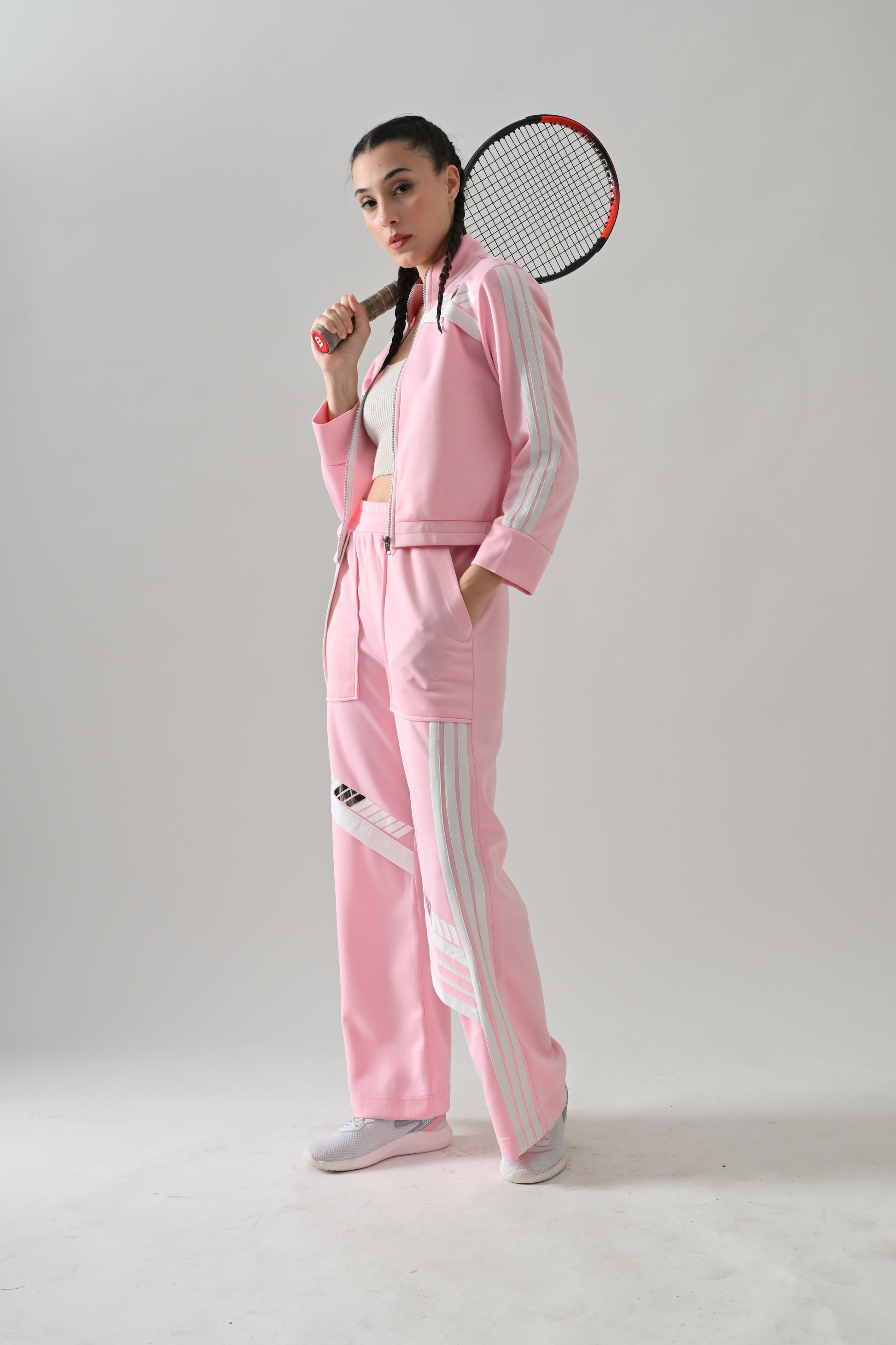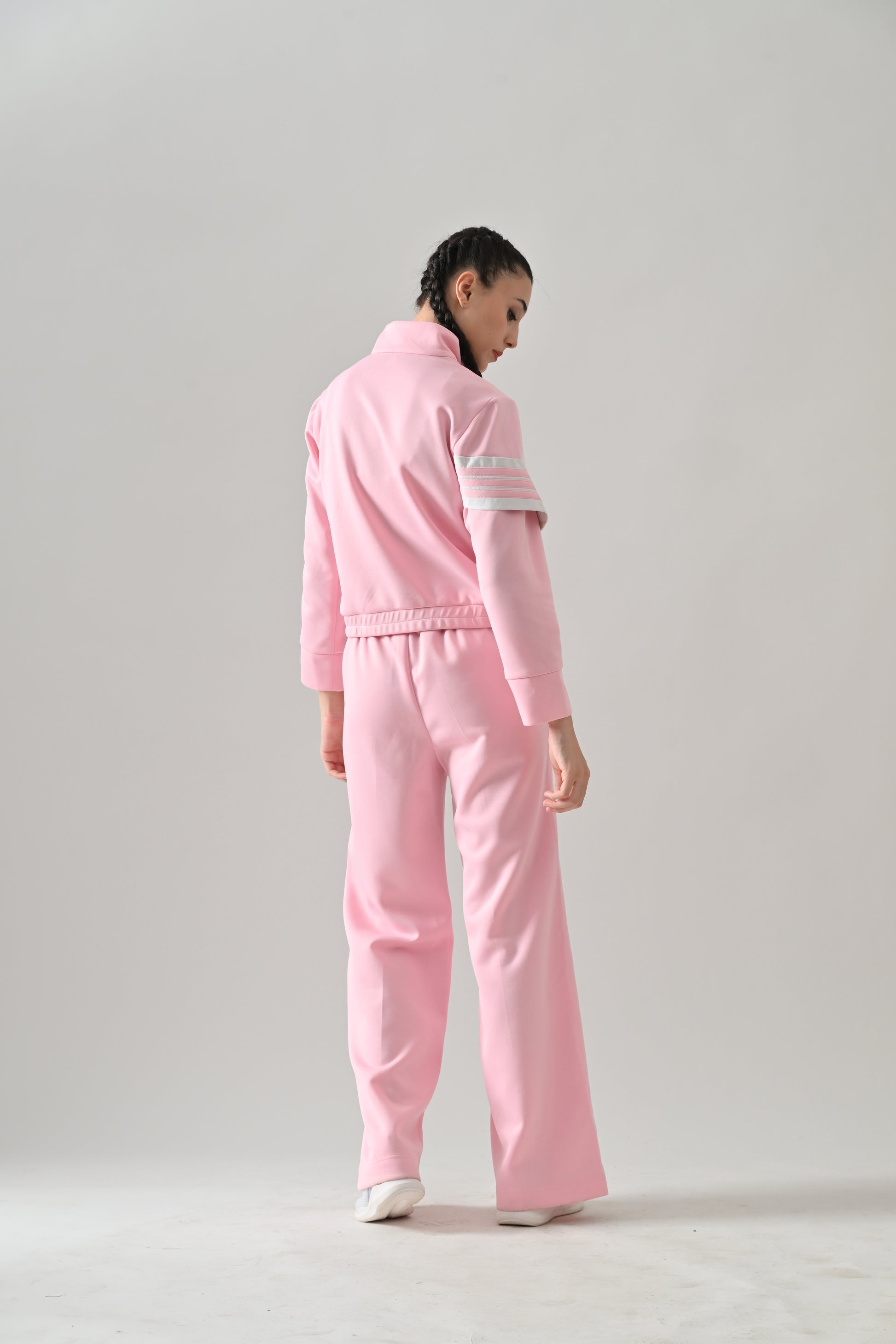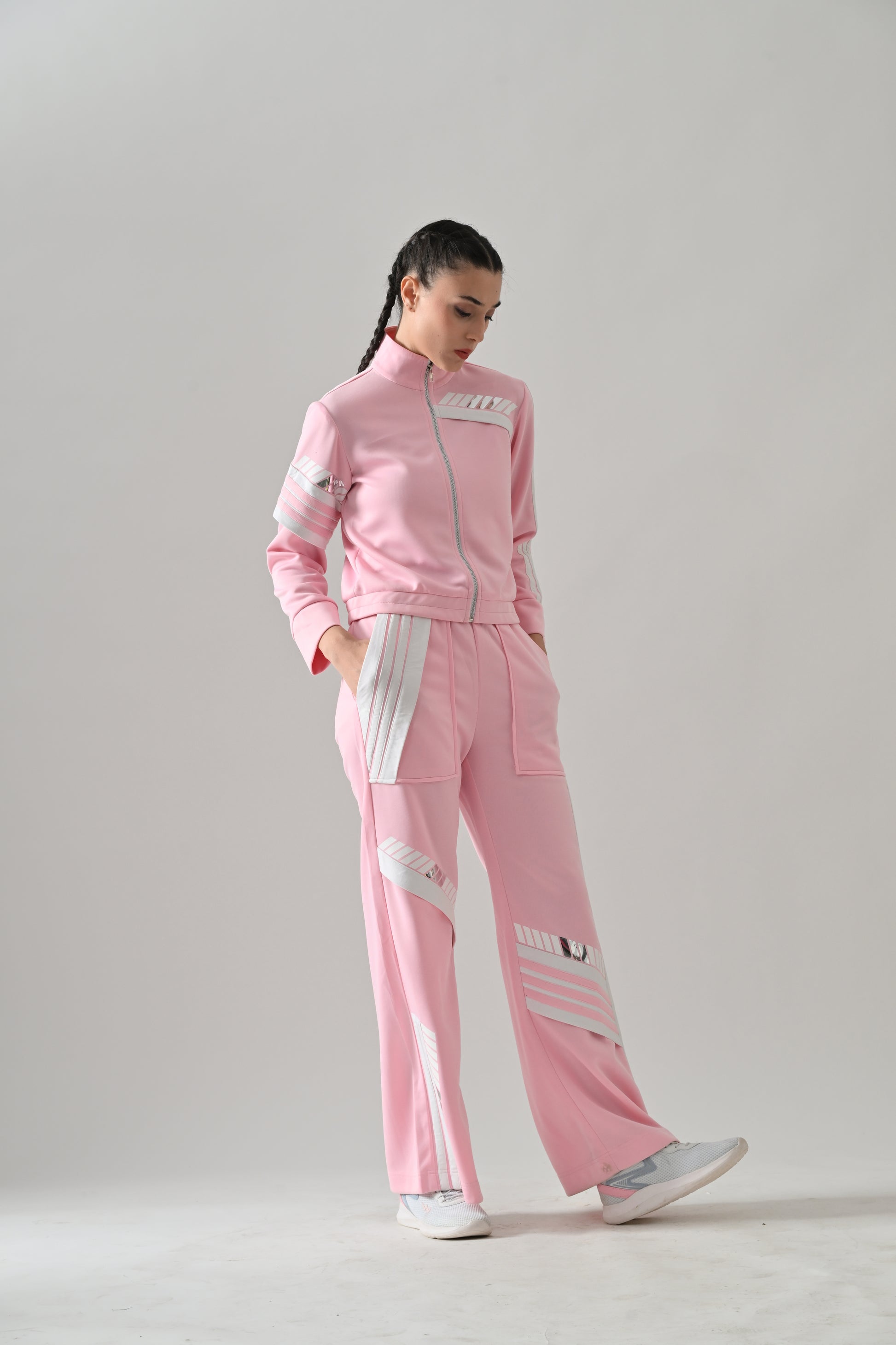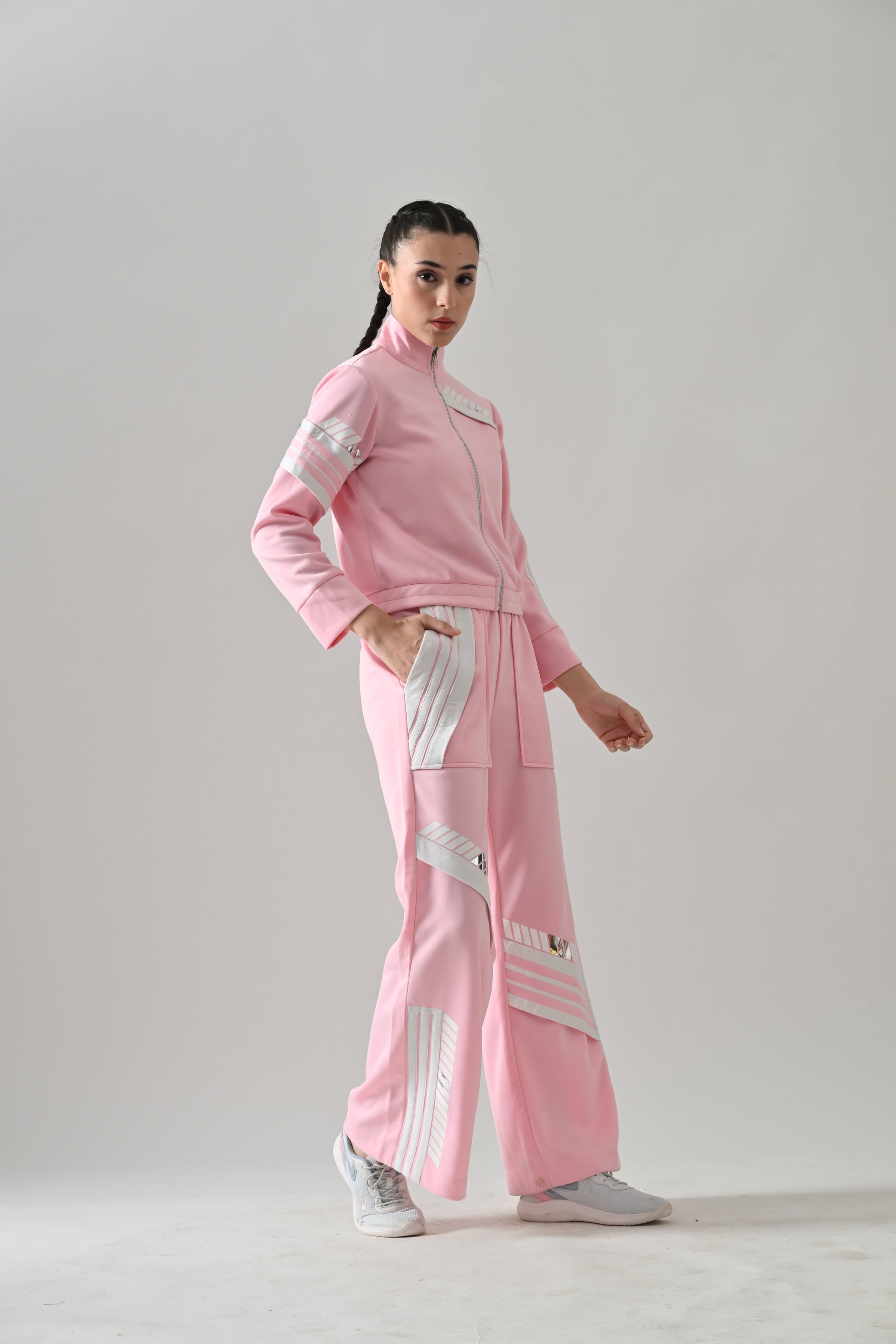 Pastel Hustle doesn’t try hard—it is hard. Soft blush and white in a 3-piece athleisure form with subtle reflective work, stripe trims and travel-worthy tailoring. Gentle in color, savage in spirit.