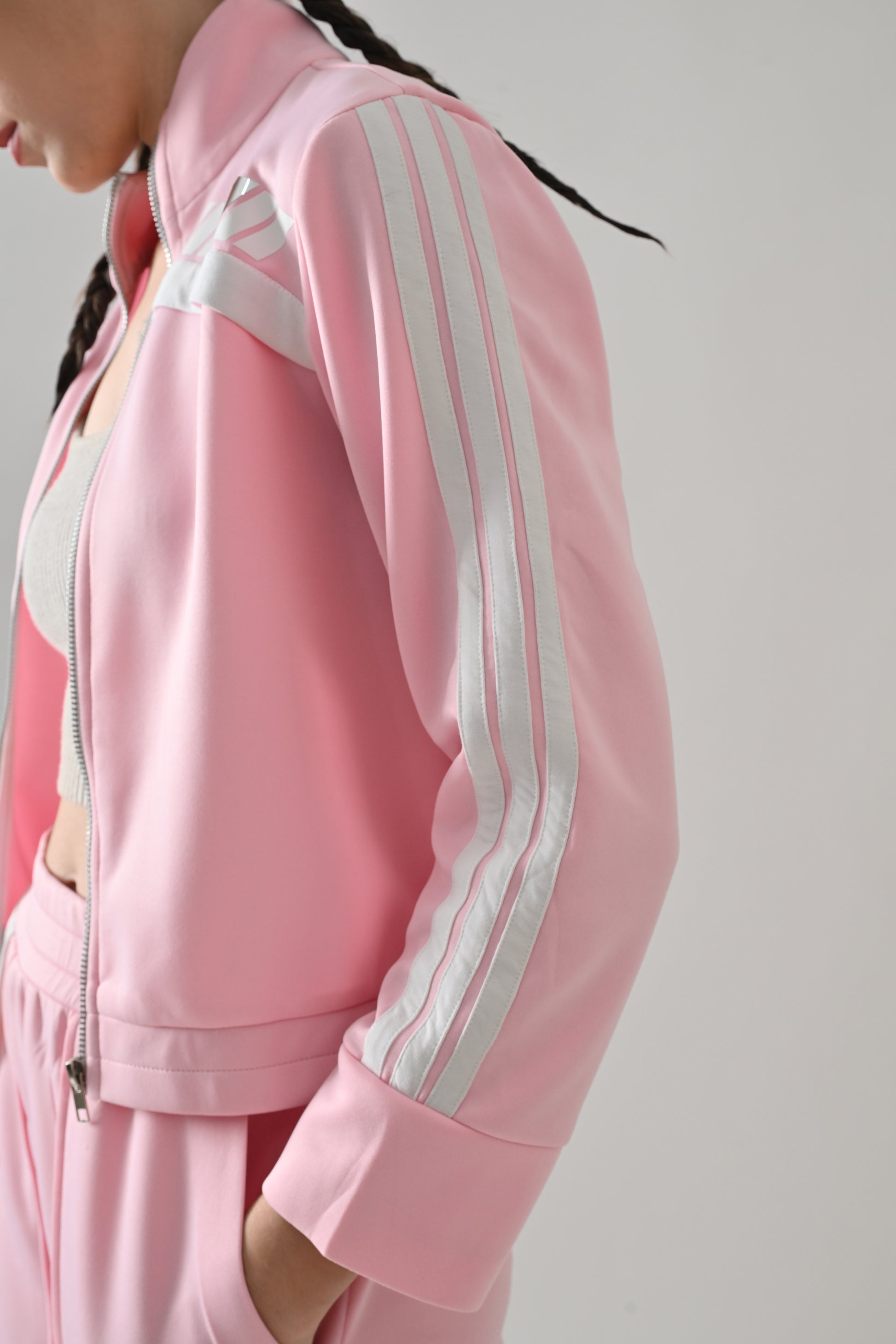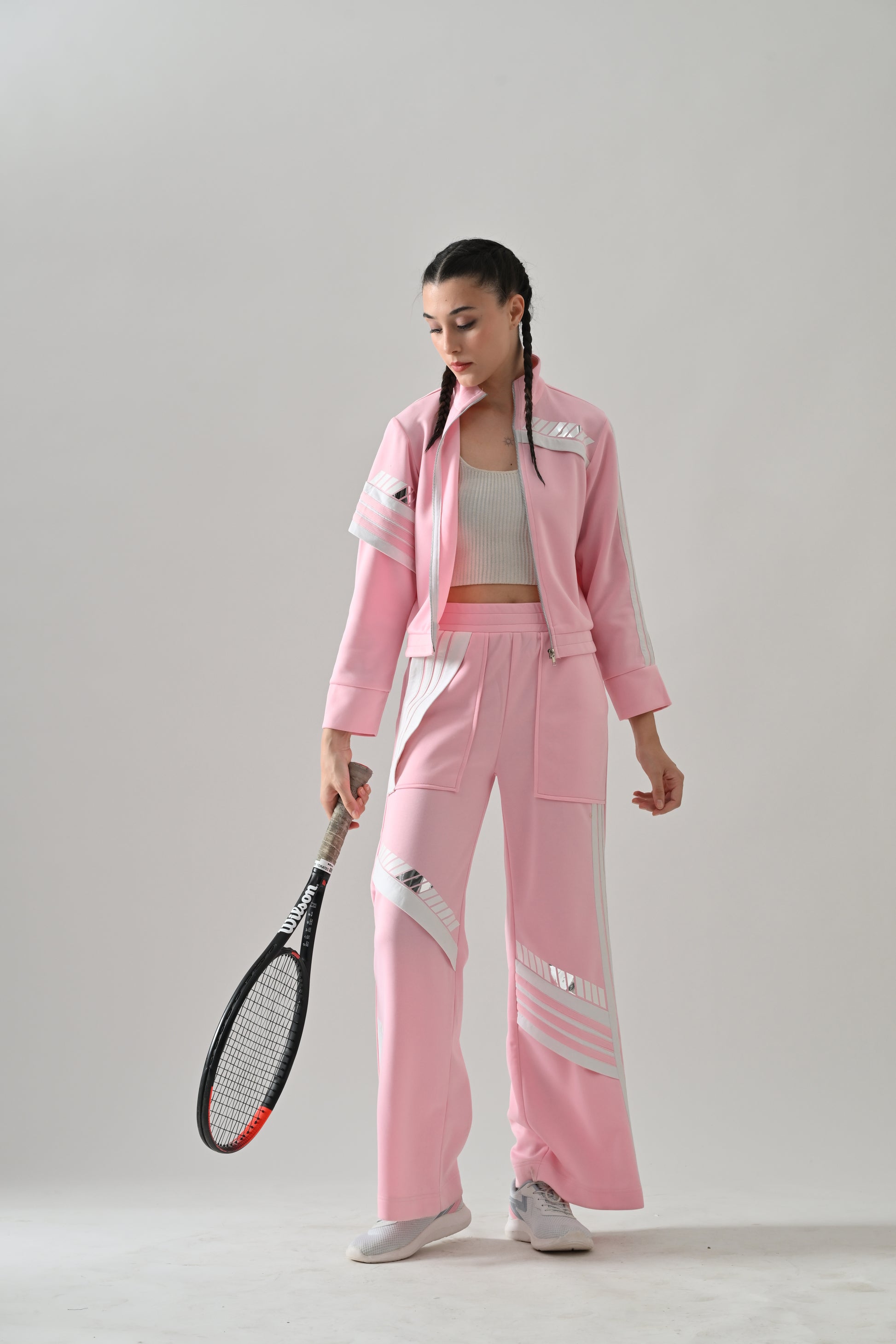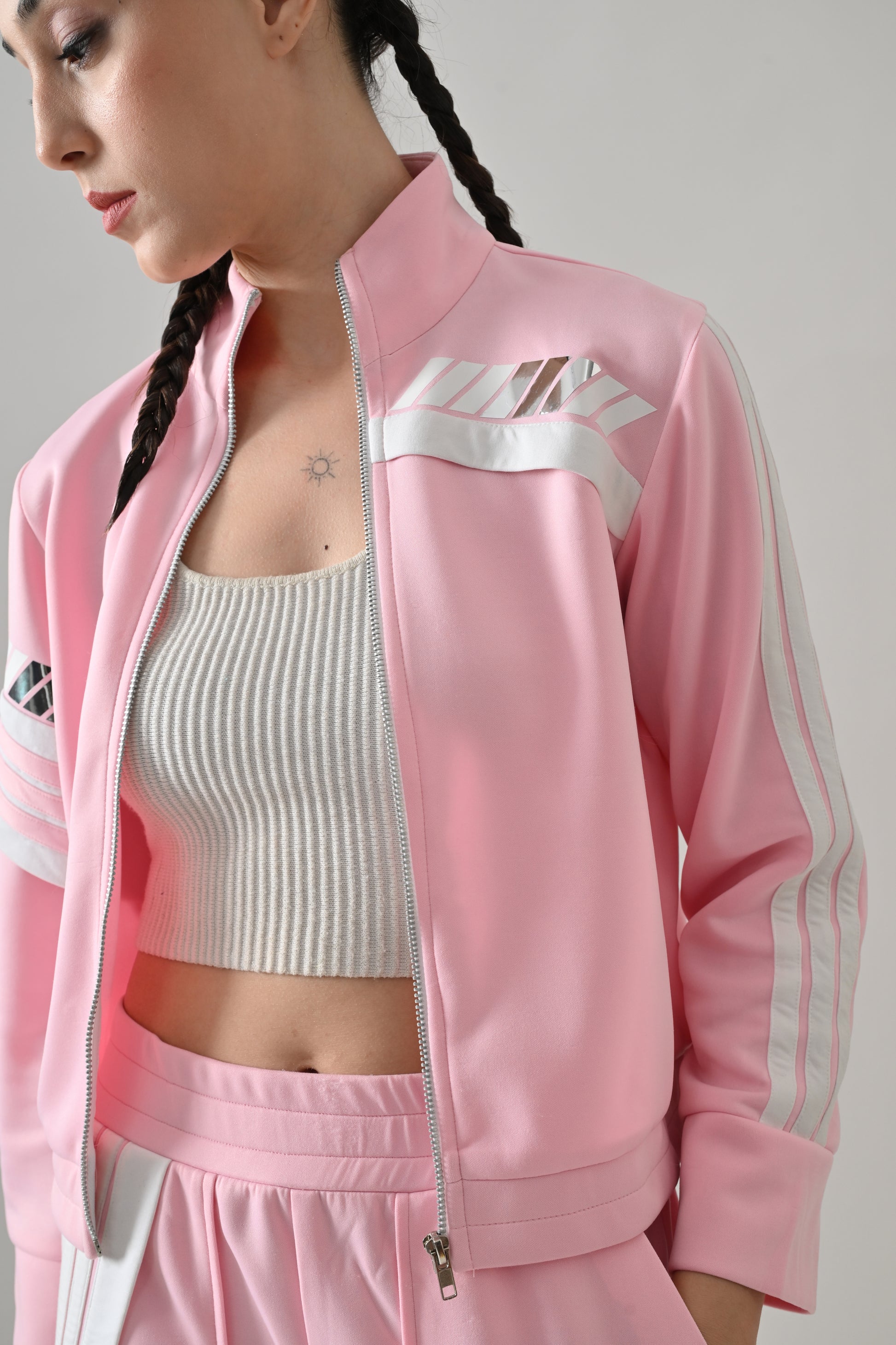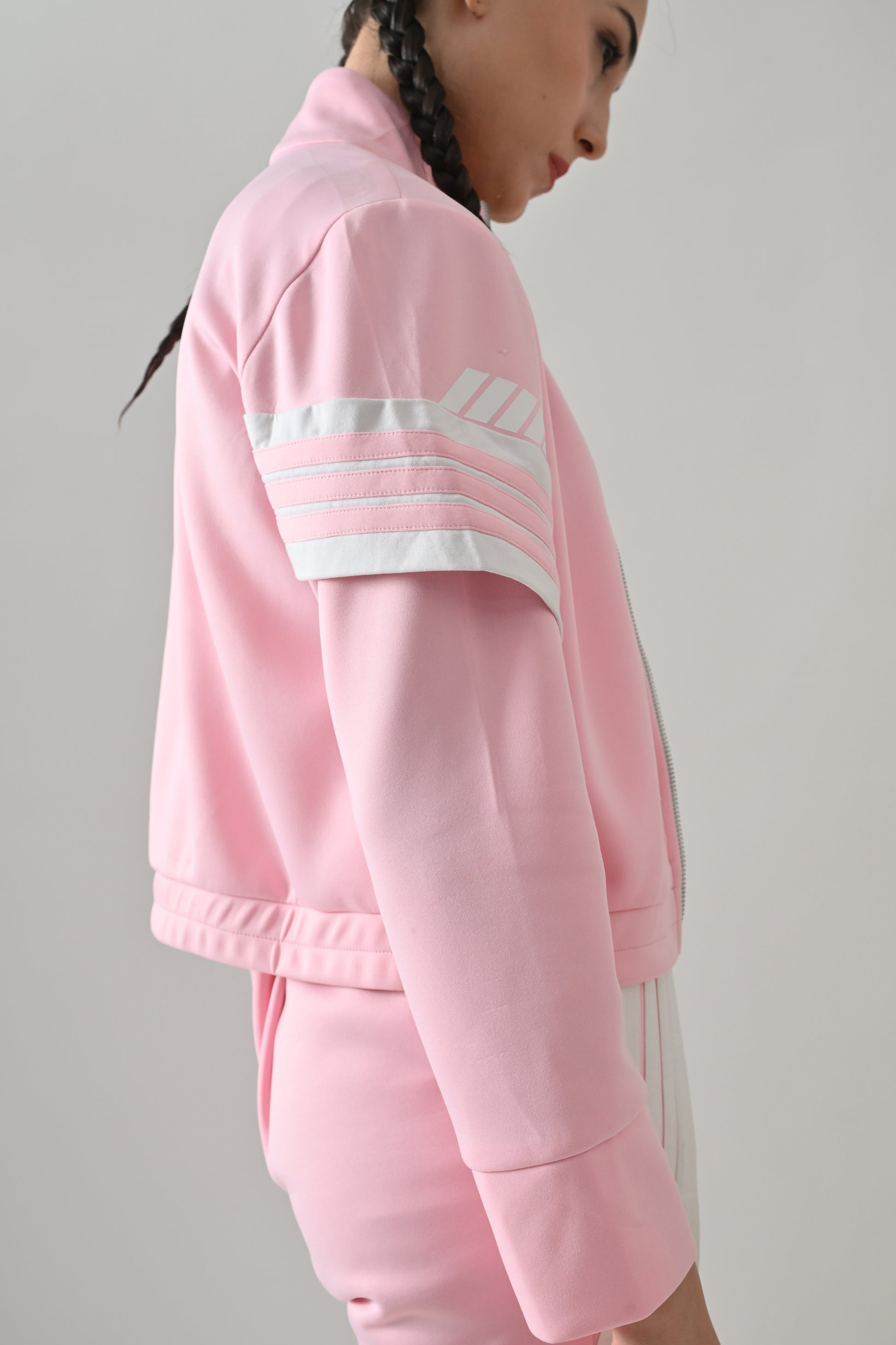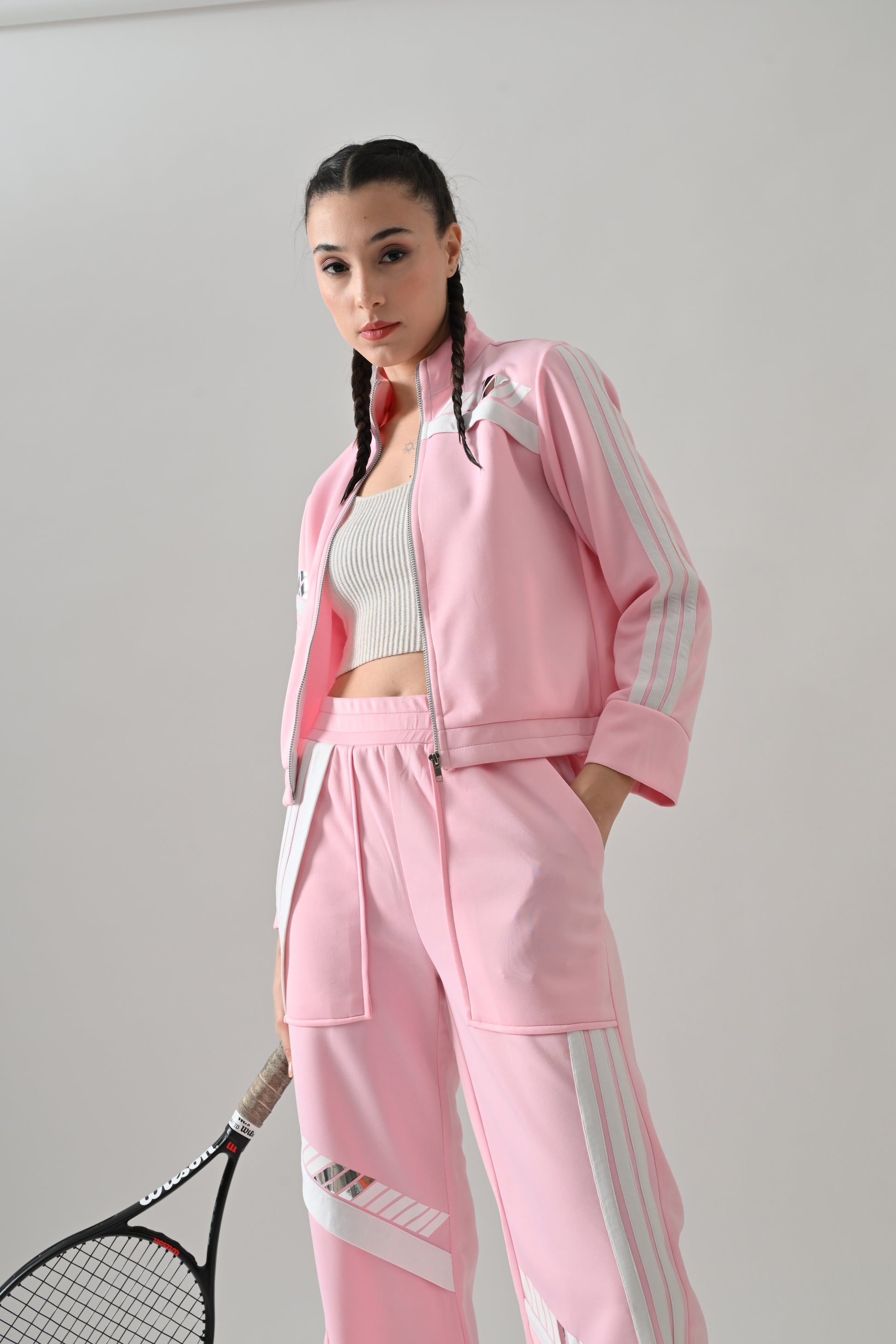 Pastel Hustle doesn’t try hard—it is hard. Soft blush and white in a 3-piece athleisure form with subtle reflective work, stripe trims and travel-worthy tailoring. Gentle in color, savage in spirit.