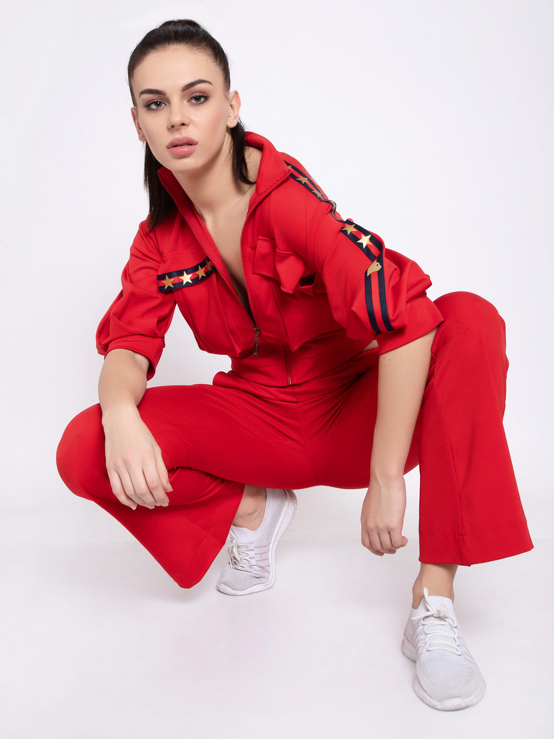 Look like a star in this laidback red jacket and track set! With sparkling star pockets, you'll be sure to make a stellar entrance and turn heads in the room! Get the star-studded style you've been dreaming of without breaking the bank - this hot-selling set by Just Billi is chic and comfy!