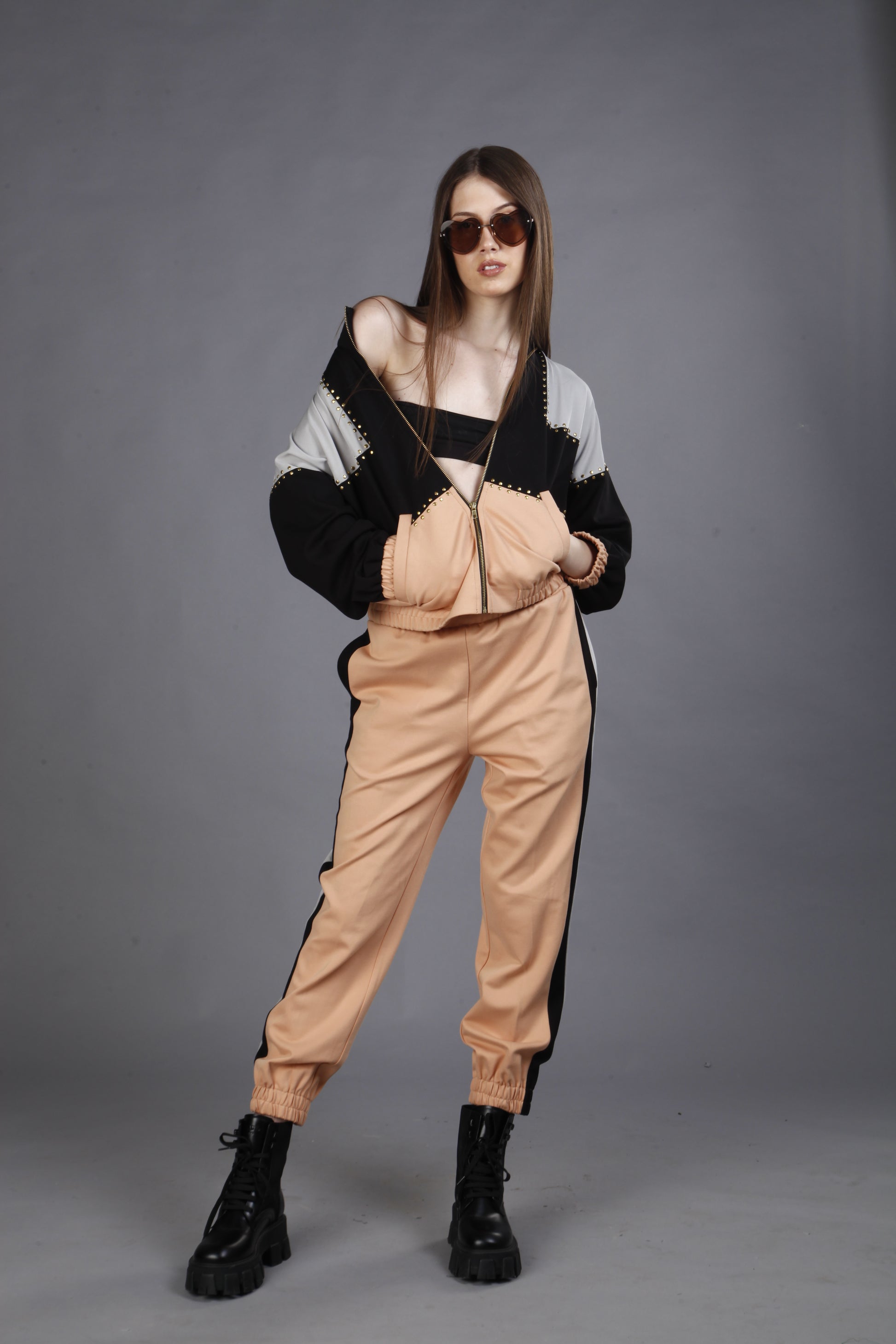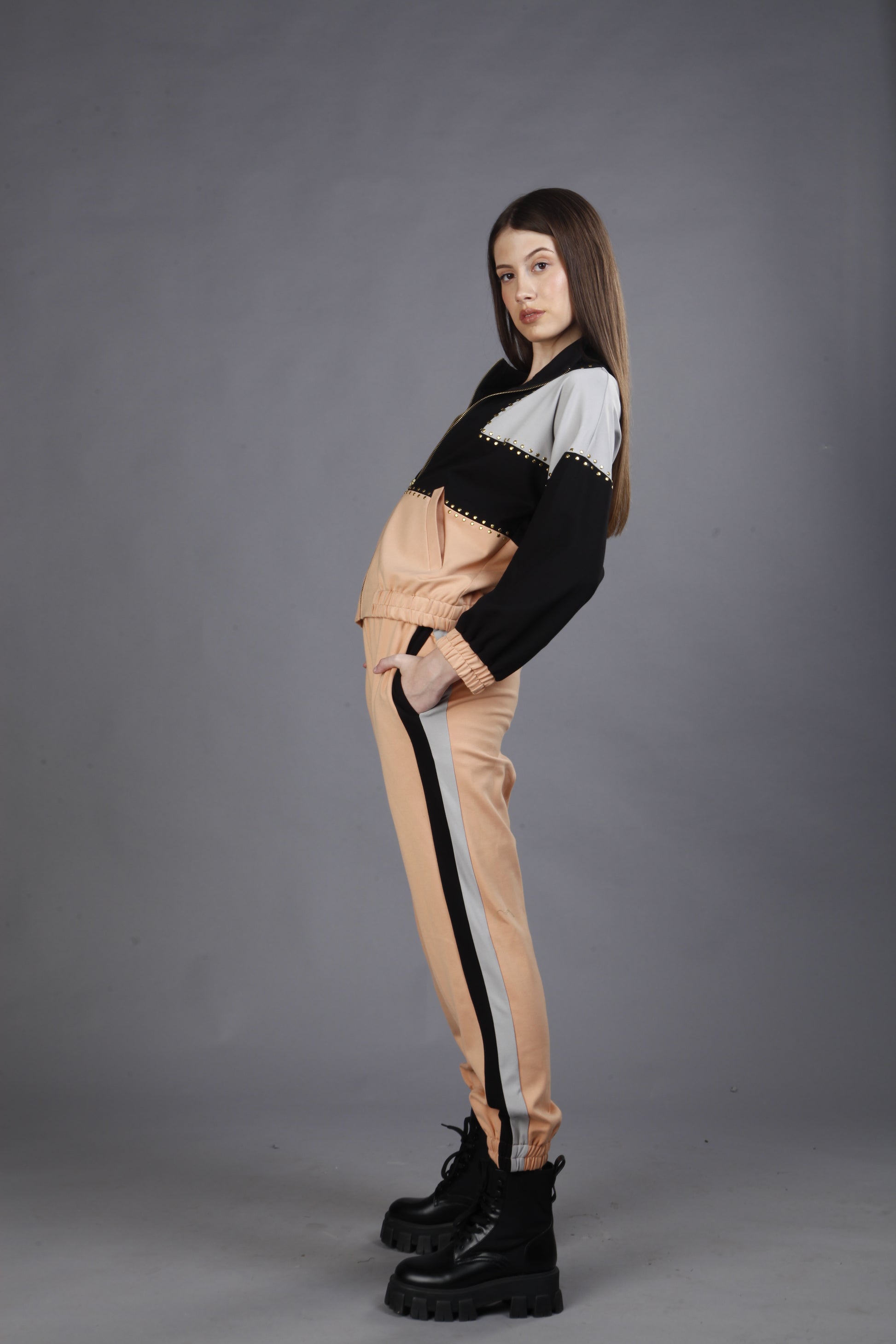 Introducing the “Tri-Tone” athleisure set, where modern style meets dynamic design. This standout outfit features a sleek jacket with eye-catching stud detailing that adds an edgy touch to its clean lines. The tri-tone color scheme—combining bold hues in a strategic pattern—brings a vibrant and energetic vibe to the ensemble. Paired with coordinating joggers, the “Tri-Tone” set offers a cohesive and polished look that seamlessly transitions from workouts to casual outings.