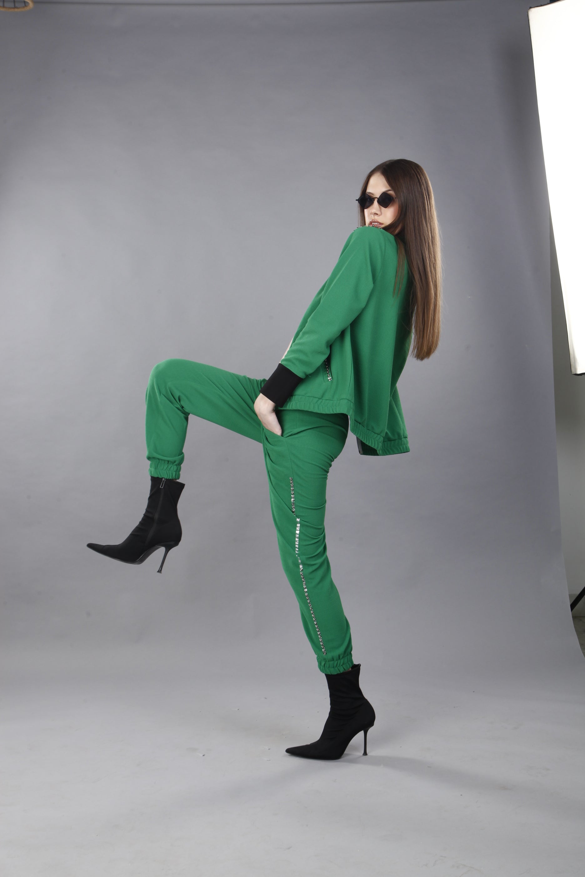This dynamic athleisure set features a jacket and joggers both enhanced with striking stud detailing along the sides. The jacket showcases a streamlined design with stud accents that add a bold touch, merging style with functionality. The joggers complement the jacket with matching stud embellishments, offering a cohesive look that stands out. Crafted for both comfort and flair, this outfit ensures you stay at the forefront of fashion while enjoying the flexibility and performance needed for an active lifestyle.